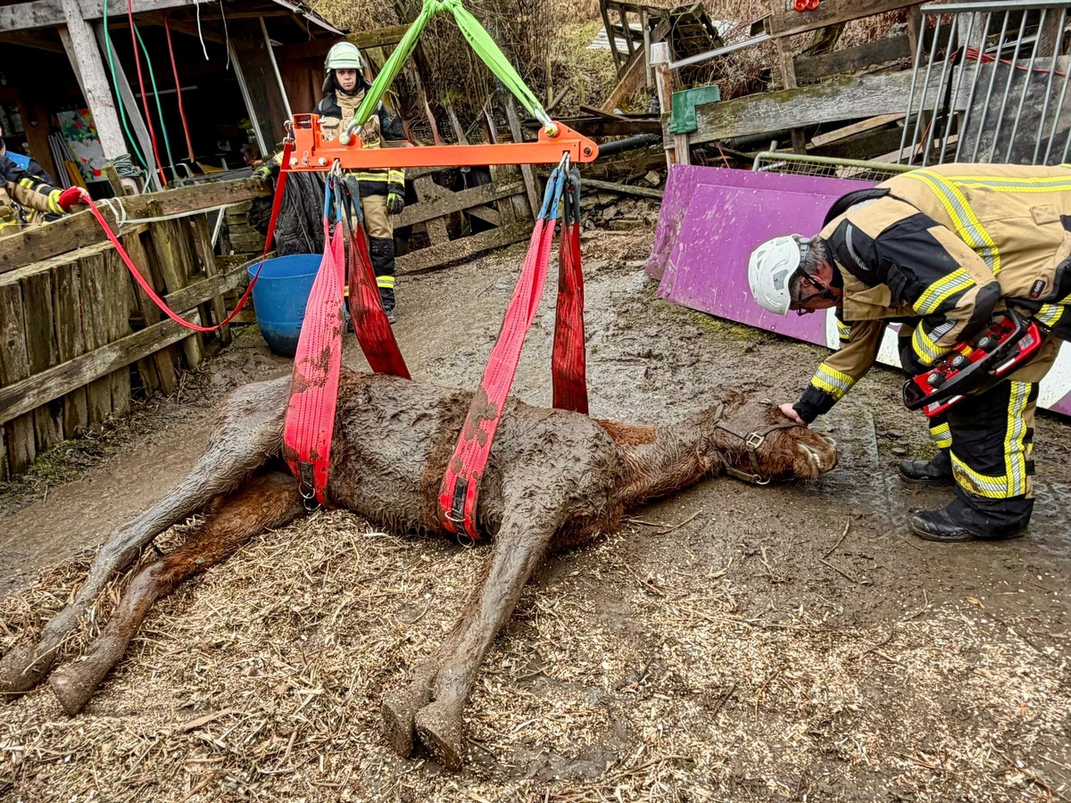 In enger Abstimmung mit dem Besitzer richteten die Einsatzkräfte das Tier anschließend mithilfe eines speziellen Hebegeschirrs und dem Kran des Rüstwagens schonend auf. Trotz der Maßnahmen verschlechterte sich der Gesundheitszustand des über 20 Jahre alten Pferdes jedoch weiter. Eine hinzugezogene Tierärztin musste das Tier noch an der Einsatzstelle einschläfern.