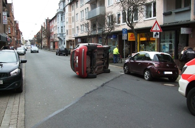 Die 49-jährige Frau aus Schellerten saß zum Unfallzeitpunkt alleine in ihrem neuwertigen Fiat 500 und befuhr die Einumer Straße in Richtung Innenstadt. Kurz nachdem sie vom Moltekreisel aus in den fortführenden Teil der Einumer Straße nach rechts abgebogen war, streifte sie mit ihrem Fahrzeug aus Unachtsamkeit heraus einen rechtsseitig geparkten Opel Adam. Dabei war die Frau scheinbar so unglücklich auf die hintere linke Seite des Opels aufgefahren, dass ihre rechte Wagenseite faktisch ausgehebelt wurde, die Pkw-Räder den Bodenkontakt verloren und über das Blechkleid des geparkten Fahrzeugs rollten. Durch diesen Effekt kippte ihr Fiat 500 nach wenigen Metern einfach auf die linke Karosserieseite und blieb unmittelbar vor dem geparkten Opel Adam, in Höhe der dortigen Sparkassenfiliale, liegen.