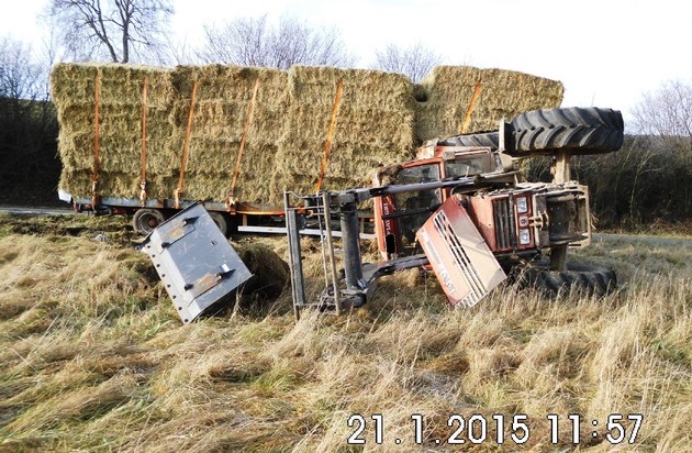 Alfeld(hoe)- Am Mittwoch, 21.01.2015, um 11:15 Uhr, befährt ein 59-jähriger Einwohner aus Eschershausen mit seinem landwirtschaftlichen Zug, bestehend aus Zugmaschine und einem Anhänger, die B 240 aus Richtung Eschershausen kommend in Richtung Capellenhagen. Nach dem Überqueren der Ith-Kuppe gerät der landwirtschaftliche Zug auf der Gefällstrecke ins Rutschen und kommt nach rechts von der Fahrbahn ab. Die landwirtschaftliche Zugmaschine kippt dann auf die Seite, der Anhänger, belanden mit Strohballen, bleibt stehen. Der Fahrzeugführer wird bei dem Unfall leicht verletzt und vom Rettungsdienst dem Bernward-Krankenhaus in Hildesheim zugeführt. Der geschätzte Schaden wird mit etwa 3000 Euro angenommen.