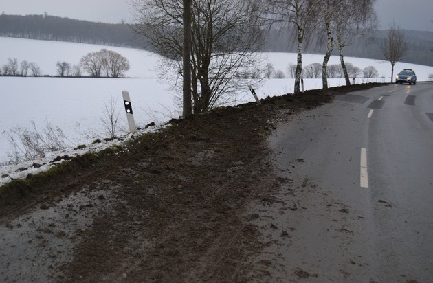 Lamspringe.gotmar Ein Spaziergänger meldet am 02.02.2015, gegen 09:00Uhr, einen Böschungsschaden an der L 466, kurz vor der Ortseinfahrt Lamspringe aus Richtung Glashütte. Auf einer Länge von etwa 200 m ist der linke, aufgeweichte Böschungsraum durch tiefe und breite Fahrspuren beschädigt, auch sind dort zwei Leitpfäle umgeknickt und ein Straßenbaum wurde nicht unwesentlich beschädigt. Die rechte Fahrspur ist durch das aufgewühlte Erdreich erheblich verunreinigt und muss durch die SWtraßenmeisterei aufwendig gereinigt werden. Vermutlich kam an der Stelle ein Lkw aus bisher ungeklärter Ursache nach rechts von der Fahrbahn ab und verursachte diesen Schaden, der von der Polizei auf etwa 1000,- Euro geschätz wird. Die Polizei in Bad Salzdetfurth fragt nun, wer in den Morgenstunden des 02.02.2015 Beobachtungen im Bereich Lamspringe gemacht hat, die auf das verursachende Fahrzeug Aufschluss geben können. Hinweise werden unter Tel. 05063/901115 erbeten.