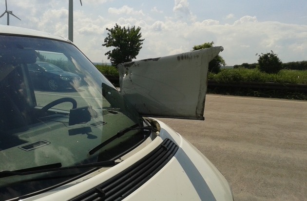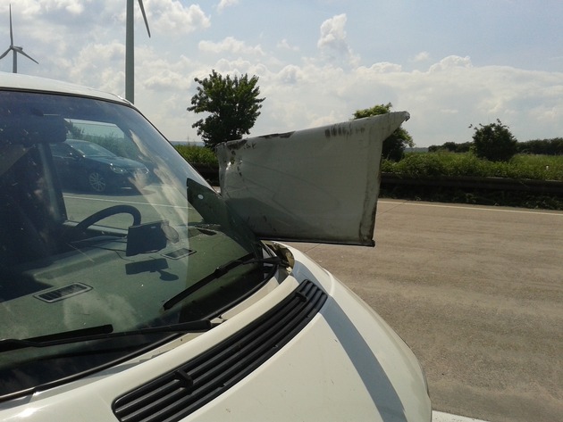 Nachfolgende Verkehrsteilnehmer, die den auf der Fahrbahn liegendnen Reifen- und Metallteilen nicht rechtzeitig ausweichen konnten, überfuhren die Teile und schleuderten diese zusätzlich noch hoch. Dabei wurde ein Verkleidungsteil einem nachfolgenden VW LT, gesteuert von einem 32-jährigem Mann aus Schleswig-Holstein, in die Windschutzscheibe geschleudert.