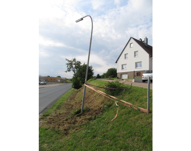 Am 30.06.17, 17:05 Uhr, wurde der Polizei Alfeld eine "erheblich" schräg stehende Straßenlaterne in Freden/Leine, Herrenkamp, gemeldet. Die Laterne hatte im aufgeweichten Untergrund ihren Halt verloren und neigte sich nun deutlich in Richtung Fahrbahn. Die anfangs angebotene Hilfe eines Pkw-Fahrers hatte die Polizei noch "ausgeschlagen", bis sich kurz darauf die Laterne durch die Erschütterung passierender Fahrzeuge weiter neigte und auf die Straße zu stürzen drohte.
