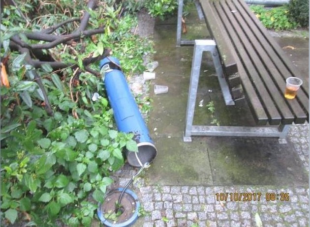 (clk.) Im Zeitraum von Montag, 9.10., bis Dienstag 10.10., 08:00 Uhr, haben bislang unbekannte Täter Sachbeschädigungen am Eingangsbereich zum Gebäude Domhof 2, Durchgang zum Hückedahl, vorgenommen. Die bisherigen polizeilichen Ermittlungen haben bisher zu keinem Erfolg geführt. Die Polizei hofft nun durch diesen Zeugenaufruf, Hinweise aus der Bevölkerung zu erhalten, durch die die Straftaten geklärt werden können. Möglicherweise handelt es sich um jugendliche Täter, die dort randaliert haben. Der Tatort wurde von den eingesetzten Polizeibeamten wie folgt beschrieben. Links neben dem Eingangsbereich ist eine kleine Sitzecke mit Bänken eingerichtet, welche mit kleinen Laternen umrandet ist. Auf der Bank linksseitig neben dem Eingang standen noch teilweise gefüllte Plastikbecher und mehrere Flaschen Energy Drink. Im Treppenbereich ist links ein Teil des Geländers vom Sockel gelöst worden. Auf Höhe der Sitzecke ist eine Fensterscheibe mittels eines unbekannten Gegenstandes zerstört worden. Linksseitig hinter der Sitzbank ist eine Laterne vollständig zerstört worden. Außerdem ist eine Dachrinne, welche links neben dem Vordach des Eingangsbereich zum Boden verläuft, abgerissen worden. Nach ersten Schätzungen beläuft sich der Schaden auf mindestens 1500,00 Euro. Hinweise nimmt die Polizei Hildesheim unter Telefon 05121-939115 entgegen.
