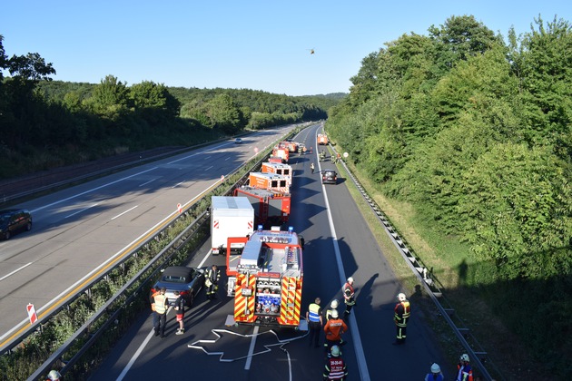 Am 06.07.2018 gegen 19:00 Uhr bildete sich auf der A 7, zwischen der Rastanlage Hildesheimer- Börde und der Anschlußstelle Derneburg, Fahrtrichtung Süden ein Stau, da die Autobahn aufgrund einer Baustelle nur einspurig war. Fünf Pkw-Fahrer übersahen das Stauende und fuhren ineinander. Betroffen waren zwei Pkw aus Deutschland und je einer aus Dänemark, Schweden und Tunesien. In den ausländischen Pkw saßen insgesamt 7 Kinder im Alter zwischen 4 und 11 Jahren. Alle 7 Kinder und insgesamt 5 Erwachsene wurden bei dem Unfall verletzt. Die Verletzungen waren, bis auf die einer älteren Dame, die schwer aber nicht lebensgefährlich verletzt wurde, nur leichterer Art. Der Sachschaden wird auf mehr als 100.000,- EUR geschätzt. Aufgrund der Anzahl der Verletzten wurde durch die Leitstelle der Feuerwehr MANV 20 (Massenanfall von Verletzten mit ca. 20 Personen) ausgelöst. Zum Einsatz kamen die Feuerwehren aus Bad Salzdetfurth, Heinde und der FTZ (Feuerwehrtechnischen Zentrale) mit insgesamt 31 Einsatzkräften unter der Leitung des Stadtbrandmeisters aus Bad Salzdetfurth. An Rettungskräften waren insgesamt sechs RTW und 2 NEF aus Hildesheim und Salzgitter, sowie der Rettungshubschrauber Christoph 30 aus Wolfenbüttel vor Ort. Weitere 4 RTW wurden an der Rastanlage Hildesheimer Börde in Bereitschaft gehalten. Leiter der Rettungskräfte war die Leitende Notärztin aus dem St. Bernward Krankenhaus in Hildesheim. Von der Polizei waren insgesamt 5 Streifenwagen der Autobahnpolizei, aus Bad Salzdetfurth und der Stadt Hildesheim im Einsatz. Weiter waren zwei Kräder der Johanniter Unfall-/ Stauhelfer eingesetzt, die sich vornehmlich um die Personen im Stau kümmerten. Auch waren mehrere Abschleppunternehmen und die Autobahnmeisterei vor Ort. Zur Versorgung der Verletzten, der Unfallaufnahme, der Bergung der Fahrzeuge und anschließenden Reinigung der Fahrbahn musste die A 7 in Fahrtrichtung Süden bis 23:00 Uhr gesperrt werden. Auf der A 7 staute sich der Verkehr zurück bis Hildesheim auf einer Länge von bis zu 10 km. Auch auf den Umleitungsstrecken und hier insbesondere der B 6 kam es zu erheblichen Verkehrsbehinderungen. Im Stau ereigneten sich zwei weitere kleinere Auffahrunfälle.