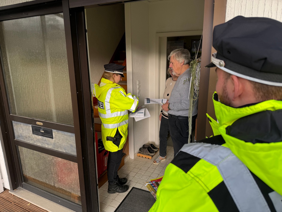 Die Einsatzkräfte waren in den Wohngebieten unterwegs und verteilten Informationsflyer, in denen die wichtigsten Hinweise zur Sicherung von Türen, Fenstern und Zugängen übersichtlich zusammengefasst sind. In persönlichen Gesprächen wurden den Anwohnerinnen und Anwohnern zudem konkrete Tipps vermittelt. Selbst einfache Maßnahmen erhöhen die Sicherheit deutlich - das zeigt der hohe Versuchsanteil beim Wohnungseinbruch: Bundesweit scheiterten im Jahr 2024 rund 45,7% aller Einbrüche bereits im Versuchsstadium.