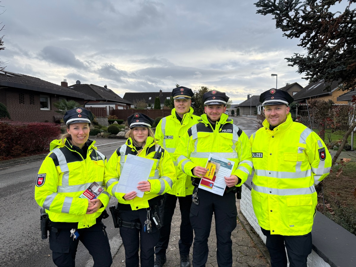 dauerhaft geschlossene Rollläden.Der Leiter der Polizeiinspektion Hildesheim, Michael Weiner, der sich gemeinsam mit dem Kommissariatsleiter, Jannes Heinemann, sowie der Leiterin des Einsatz- und Streifendienstes des PK Elze, Anna Gerock, an der Aktion persönlich beteiligte, betonten gemeinsam: "Regelmäßige präventive Aktionen sind wichtig, um die Bürgerinnen und Bürger zu sensibilisieren. Prävention ist der beste Weg, um Einbrüche in den persönlichen Lebensbereich unserer Mitmenschen zu verhindern. Denn Einbrüche verursachen nicht nur materiellen Schaden, sondern beeinträchtigen auch massiv das Sicherheitsgefühl der Betroffenen, wenn Unbekannte in ihren höchstpersönlichen Lebensraum eindringen. Im direkten Austausch mit den Bürgerinnen und Bürgern wurde jederzeit spürbar, dass unsere Präsens einen sehr positiven Eindruck hinterließ. Wir setzen diese Maßnahmen auch in den nächsten Wochen fort."
