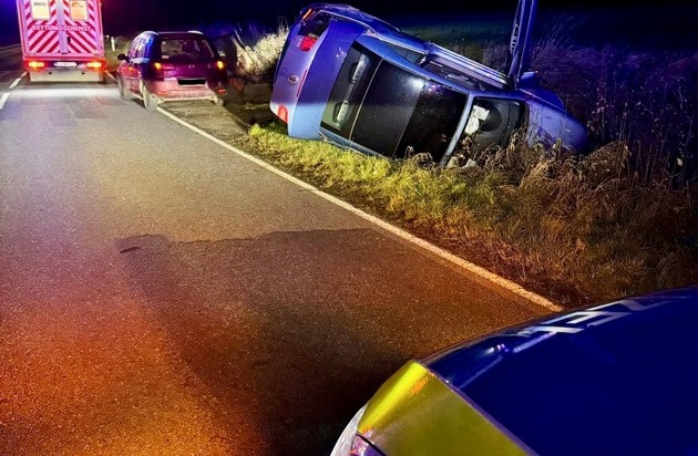 Freden (rst) - Am frühen Mittwochmorgen, 03.12.2025, kam ein 19-jähriger Fahrer aus Lamspringe gegen 05:59 Uhr auf der K 404 zwischen Everode und Hörsum mit seinem VW Eos aus bislang ungeklärter Ursache nach links von der Fahrbahn ab. Das Fahrzeug geriet in den Straßengraben und blieb auf der rechten Fahrzeugseite liegen.