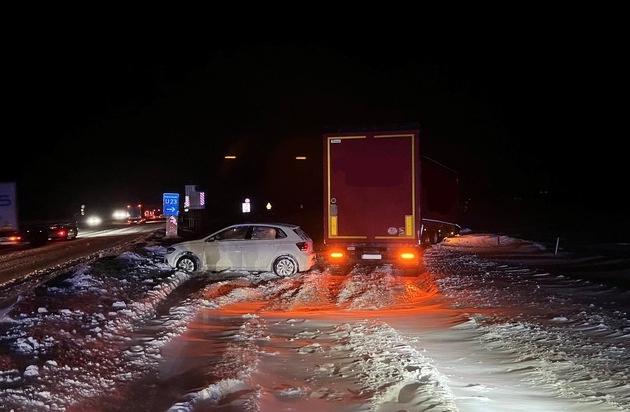 BAB 7 - (ede) Im Zeitraum des 10.01.2026 00:00 Uhr bis zur jetzigen Berichtszeit kam es nach einem ereignisreichen Freitag zu einer deutlichen Entspannung der Verkehrslage auf der BAB 7 im Zuständigkeitsbereich der Autobahnpolizei Hildesheim. Während der Nachtzeit ereigneten sich lediglich zwei Verkehrsunfälle mit Blech- und ohne Personenschäden. Auf der Tank- und Rastanlage Hildesheimer Börde Ost touchierte gegen 01:10 Uhr ein Sattelzug beim Rangieren einen geparkten Gliederzug. Gegen 02:55 Uhr geriet ein Sattelzug auf der BAB 7 kurz vor dem Dreieck Salzgitter auf der schneebedeckten Fahrbahn ins Schleudern und kollidierte mit der Außenschutzplanke. Ein folgenreicher Verkehrsunfall mit drei Beteiligten ereignete sich am frühen Morgen gegen 05:35 Uhr im Dreieck Salzgitter in der Überleitung von der BAB 7 in Fahrtrichtung Hannover auf die BAB 39 in Fahrtrichtung Braunschweig. Eine 25-Jährige geriet mit ihrem PKW VW Polo auf der stark mit Schnee bedeckten Fahrbahn ins Schleudern und blieb quer in einer Schneewehe stecken. Ein nachfolgender 32-Jähriger konnte mit seinem PKW VW Golf nicht mehr rechtzeitig abbremsen und touchierte den VW Polo am Heck. Ihm wiederum folgte ein Gliederzug, der von einem 24-Jährigen gesteuert wurde. Der Gliederzug touchierte ebenfalls den VW Polo, prallte in das Heck des VW Golf, rutschte rechtsseitig in den Straßengraben und gegen einen dortigen Wildschutzzaun. Alle Beteiligten blieben glücklicherweise unverletzt. Für die Bergung aller Fahrzeuge und Herstellung der Befahrbarkeit der Fahrbahn durch Schneepflüge der Autobahnmeisterei Hildesheim musste die Überleitung bis ca. 11 Uhr gesperrt werden. Seit den darauffolgenden Morgenstunden ist eine deutliche Entspannung der Einsatzlage zu verzeichnen. Eine durchgängige problemlose Befahrbarkeit der BAB 7 ist durch den starken Einsatz des Winterdienstes der Autobahnmeisterei im Norden und des privaten Autobahnbetreibers VIA Niedersachsen im Süden, sowie der nachlassenden Schneefälle und des Windes gegeben. Lediglich auf den Parkplätzen und Rastanlagen kann es vereinzelt noch zu größeren Schneemengen auf den Fahrbahnoberflächen kommen.