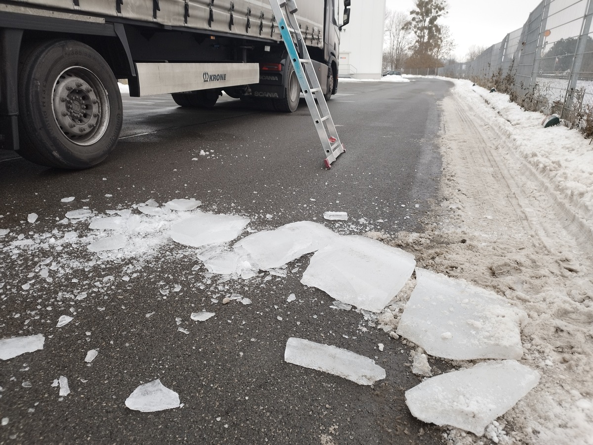 Am 29.01.2026, gegen 14 Uhr, kam es im Bereich des Autobahndreiecks Salzgitter zu einem in diesen Tagen typischen Unfall, bei dem ein PKW durch die herabfallende Eisscholle eines Sattelzugs getroffen worden ist. Hierbei wurde die Windschutzscheibe des Autos schwer beschädigt. Im Rahmen der Unfallaufnahme überprüften die eingesetzten Polizeibeamten mit Hilfe einer Leiter das Dach des Sattelaufliegers. Neben einigem Schnee befand sich eine rund 120cm lange, 30cm breite und in der Mitte bis zu 8cm dicke Eisplatte mit entsprechend schwerem Gewicht. Hätte sich eben diese Eisplatte oder einzelne Brocken davon während der Fahrt gelöst, wäre es sicher nicht bei einer gesprungenen Windschutzscheibe geblieben, sondern zu weitaus erheblicheren Unfallfolgen gekommen.