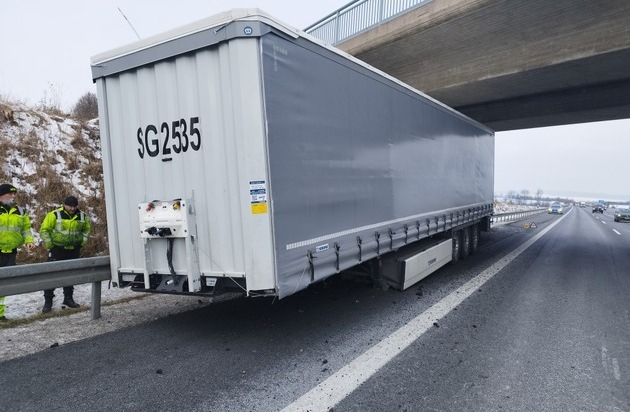 A 7, Bockenem, (eis), Unfassbares Glück hatte der 51jährige Fahrer eines Sattelzuges aus Gießen (Hessen) der die BAB 7 am Dienstag, 03.02.2026, gegen 12:00 Uhr, zwischen den Anschlussstellen Rhüden und Bockenem befuhr. Mutmaßlich aufgrund eines technischen Defektes senkten sich während der Fahrt die beiden Stützen des Sattelaufliegers ab. Der 51jährige bemerkte dieses und lenkte seinen Sattelzug geistesgegenwärtig auf den Seitenstreifen. Erst hier erreichten die Stützen den Asphalt und rissen diesen auf einer Länge von mehreren Metern auf. Schließlich löste sich der Sattelauflieger von der Sattelzugmaschine, touchierte die Außenschutzplanke und kam sicher zu stehen - die abgerissenen Druckluftleitungen zwischen der Zugmaschine und dem Auflieger sorgten systembedingt für eine Vollbremsung des Anhängers. Ohne das couragierte Reagieren des Fahrers des Sattelzuges hätte sich für ihn und alle nachfolgenden Verkehrsteilnehmenden eine unkalkulierbare Gefahrensituation ergeben können. So kam es letztlich lediglich zu Sachschäden. Der beschädigte Sattelauflieger wurde später durch ein Bergungsunternehmen mittels Krans wieder rollfähig gemacht und von der Fahrbahn geschleppt. Die Schäden an der Fahrbahn und der Schutzeinrichtung beeinträchtigen den durchgehenden Verkehr nicht und werden später instandgesetzt. Der Verkehr auf der Richtungsfahrbahn wurde lediglich während der Bergung des Sattelaufliegers leicht beeinträchtigt.