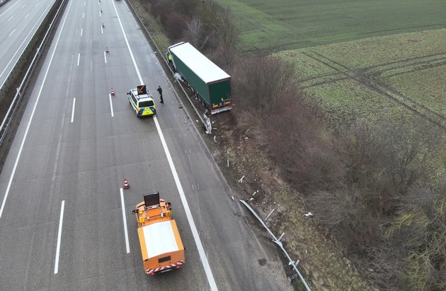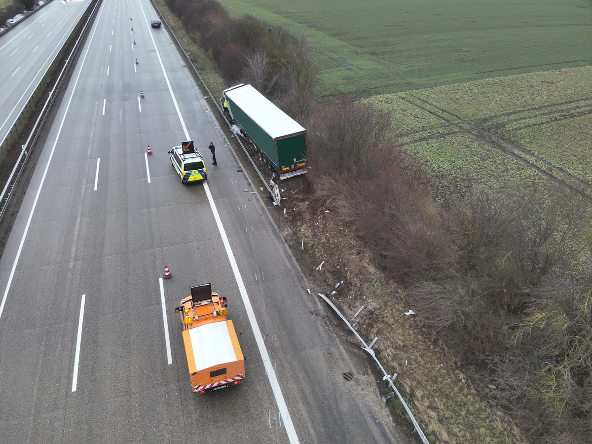 BAB 7 / Hotteln (fau) Am 21.02.2026, 04:30 Uhr, kommt es auf der BAB 7 kurz vor dem Parkplatz An der Alpe in Fahrrichtung Hildesheim aus Hannover kommend zu einem Verkehrsunfall mit 6 Beteiligten. Ersten Ermittlungen nach befuhr der 31-järhige Unfallverursacher mit seinem Tesla auf dem ersten Überholfahrstreifen. Vermutlich aufgrund nicht angepasster Geschwindigkeit bei Regen und regennasser Fahrbahn in Verbindung mit einem möglichen fehlerhaften Fahrstreifenwechsel stößt dieser gegen den auf dem Hauptfahrstreifen befindlichen Sattelzug. Dieser kommt durch den Zusammenstoß ins Schleudern und durchbricht die Außenschutzplanke und kommt im Grün neben der Fahrbahn zum Stehen. Ein weiterer Sattelzug und 3 PKW fahren in der Folge über auf der Fahrbahn befindliche Trümmerteile. Besonderheit bei dem verunfallten Sattelzug: Die Zugmaschine der Marke Volvo fügt über einen kombinierten Diesel - / Gasantrieb (LNG). Durch den Unfall wurde der LNG Tank beschädigte. Das Gas trat an der Unfallstelle kontrolliert aus. Durch die freiwillige Feuerwehr wurde der Gasaustritt überwacht und durch einen Schaumteppich eine mögliche Gefahrenquelle minimiert. Glücklicher Weise wurde durch den Unfall niemand verletzt, es blieb bei Sachschäden und einer aufwendigen Bergung des Sattelzuges. Für die Dauer der Unfallaufnahme und Bergung musste der Hauptfahrstreifen gesperrt werden. Durch die Sperrung kam es grundlegend zu keiner Beeinträchtigung des Verkehrs.