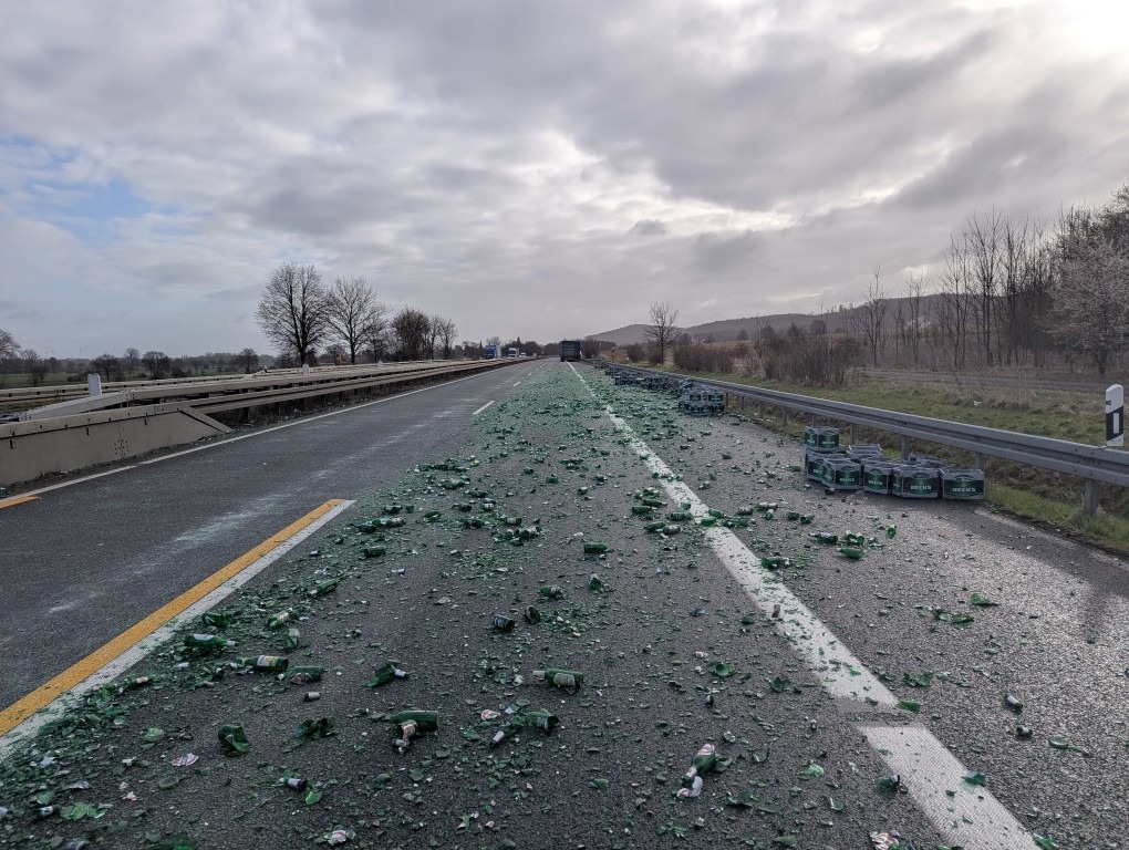Als der 59-Jährige diese passierte, verrutschte die auf dem Sattelauflieger ungesicherte Ladung, durchbrach die Plane und verteilte sich auf allen Fahrstreifen der BAB 39. Bei der Ladung handelte es sich ausschließlich um Getränkekisten, in welchem sich Leergut in Form von Glasfalschen befunden haben.