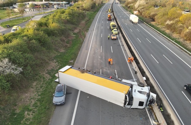 Am 16.04.2026, gegen 03:30 Uhr, befährt ein 55-Jähriger aus Bremen die BAB 7 in Richtung Hannover mit einem Sattelzug. In Höhe der genannten Unfallstelle kommt dieser aus derzeit nicht bekannter Ursache nach rechts von der Fahrbahn ab und gerät in den Grünstreifen. Anschließend fährt der Sattelzug wieder zurück auf die befestigte Fahrbahn und kippt hier auf die rechte Seite. Dadurch blockiert der Sattelzug den Stand- sowie alle Fahrstreifen der Richtungsfahrbahn Hannover. Der Fahrzeugführer wurde durch den Verkehrsunfall in seinem Führerhaus eingeschlossen und konnte unverletzt befreit werden.