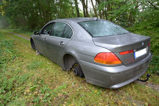 In der Nacht zum heutigen Montag drangen noch unbekannte Täter gewaltsam in die Werkstatt eines Autocenters in der Bahnhofstraße in Eschershausen ein und entwendeten dort einen älteren 7er BMW. Offensichtlich hatten es die nächtlichen Autodiebe aber lediglich auf die Felgen und Reifen abgesehen, denn das Fahrzeug selbst ließen sie nach kurzer Fahrt wieder auf einem Feldweg nahe Eschershausen zurück. Alle vier Räder waren jedoch demontiert und von den Einbrechern mitgenommen. Der Schaden beläuft sich auf ca. 3.500 ,-- EUR.