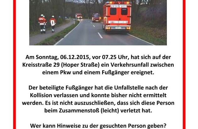 (Hameln) Am Sonntagmorgen kam es auf der Kreisstraße 29 bei Halvestorf zu einer Kollision zwischen einem Pkw und einem Fußgänger. Trotz umfangreicher Suchmaßnahmen konnte das mögliche Unfallopfer bis jetzt nicht aufgefunden werden (wir berichteten bereits in einer Pressemitteilung, siehe unten Link 1).