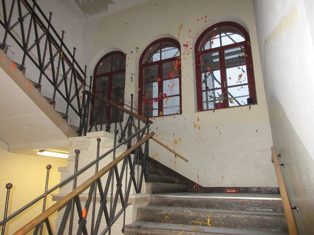 Im gesamten Gebäude öffneten sie die Schränke und Spinde, durchwühlten diese und warfen die Sachen anschließend auf den Boden. Einem Schrank wurden dort verwahrte Putzmittel entnommen und auf dem Boden verteilt. Ebenso wurde ein im Erdgeschoss vorgefundener Feuerlöscher teilweise entleert. Den größten Schaden richteten sie anschließend im 2. OG an, in dem sich der Film- und Musikraum, sowie die Aula der Schule befinden. Hier wurde der aus dem Erdgeschoss mitgeführte, sowie ein weiterer aufgefundener Feuerlöscher komplett entleert. Ebenfalls wurden diverse Flaschen mit Abdeckfarbe im Filmraum, als auch auf dem gesamten Treppen- und Flurbereich entleert. Fußboden, Wände und Decken wurden beschmiert. Selbst im Dachgeschoss wurde versucht die auf dem Boden liegenden Dämmung herauszureißen. Hier wurde mit gelber Kreide der Spruch "Wir waren hier die schwarzen Vier" an eine Wand geschrieben. Der dadurch entstandene Schaden wird nach Angaben der Polizei auf mindestens 15.000 Euro beziffert.