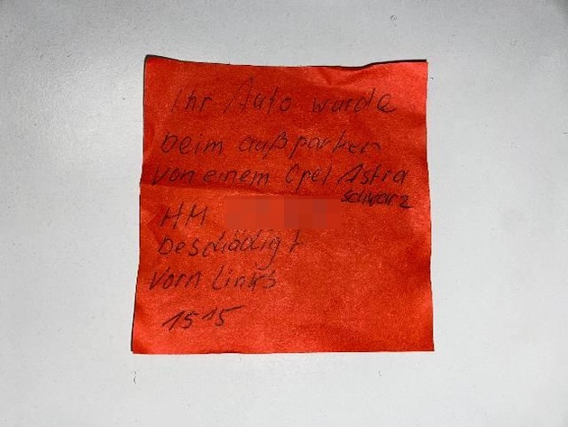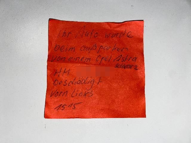 Der Unfall wurde vermutlich durch einen unbekannten Zeugen beobachtet, welcher dann eine Nachricht am geschädigten Fahrzeug hinterließ.
