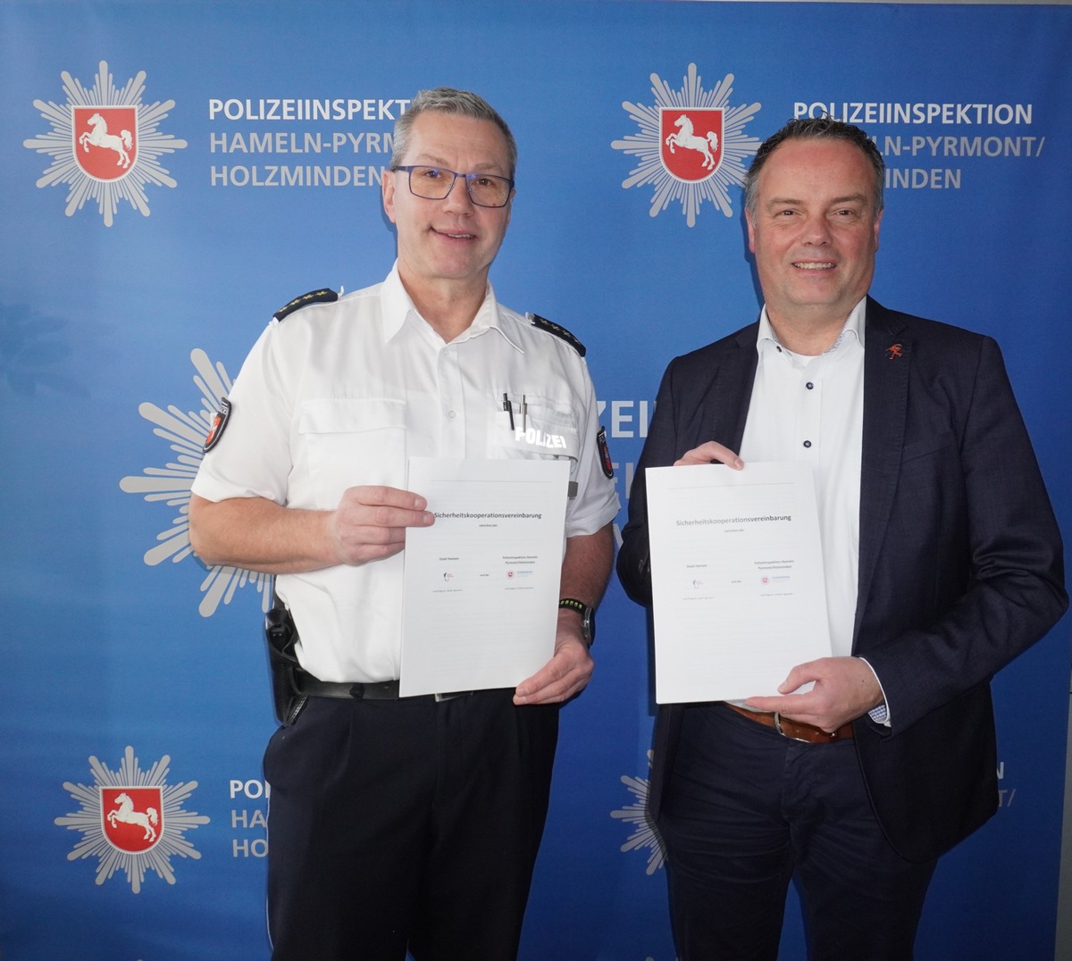 Der Leiter der Polizeiinspektion Hameln-Pyrmont/Holzminden, Matthias Kinzel, und der Oberbürgermeister der Stadt Hameln, Claudio Griese, haben gemeinsam eine umfassende Sicherheitskooperation unterzeichnet. Mit dieser Vereinbarung bekräftigen beide Institutionen ihren gemeinsamen Willen, die öffentliche Sicherheit durch eine enge und strukturierte Zusammenarbeit weiter zu stärken und nachhaltig zu verbessern.