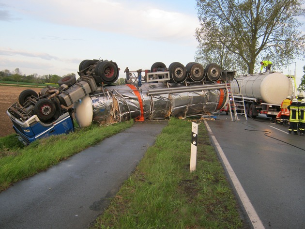 (BER)Heute morgen gegen 02.30 Uhr informierte ein Verkehrsteilnehmer die Polizei über einen verunglückten Lkw auf der Bundesstraße 65 zwischen Heuerßen und Stadthagen. Beim Eintreffen der Funkstreifenwagenbesatzung wurde der Fahrer des Lkw-Zuges von Ersthelfern aus der Fahrerkabine befreit. Der 54-jährige leichtverletzte Fahrer wurde in das Kreiskrankenhaus Stadthagen gebracht. Nach ersten Ermittlungen der Polizei befuhr der erfahrene Lkw-Fahrer die B 65 in Richtung Stadthagen, als er auf freier Strecke aus bisher ungeklärter Ursache zuerst auf den rechten unbefestigten Seitenstreifen geriet. Im Weiteren kam der Zug ins Schlingern, schleuderte quer über die Fahrbahn und kam im linken Straßenbereich zum Stillstand. Dabei überschlug sich das gesamte Fahrzeug, so dass die Zugmaschine auf dem Dach im Straßengraben lag und der Tankauflieger ebenfalls auf dem Dach quer über den Seitenstreifen, den Radweg und über einen Teil der Fahrbahn zum Liegen kam. Der mit Bierhefe beladene Auflieger riss an mehreren Stellen auf und die zähflüssige Ladung trat teilweise aus. Nach einer vorläufigen Vollsperrung der Bundesstraße durch die Polizei wurde später eine Sperrung durch die Straßenmeisterei gewährleistet. Die Feuerwehren aus Heuerßen und Lindhorst waren vor Ort und unterstützen beim Umpumpen der Bierhefe in einen Ersatztankwagen. Dieses war erforderlich, da der Auflieger mit dem Ladungsgewicht nicht geborgen werden konnte. Gegen 10.30 Uhr konnte der Zug durch Bergungsfahrzeuge auf die Räder gestellt werden. Ein Verantwortlicher der Transportfirma schätzt den Gesamtschaden auf ca. 80.000 EUR. Der Verkehr wurde über Lindhorst und Blyinghausen/Habichhorst abgeleitet. Auf Antrag der Staatsanwaltschaft Bückeburg ordnete ein Richter eine Blutprobenentnahme usowie die vorläufige Beschlagnahme des Führerscheines an.