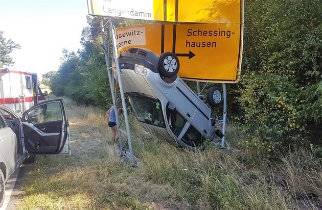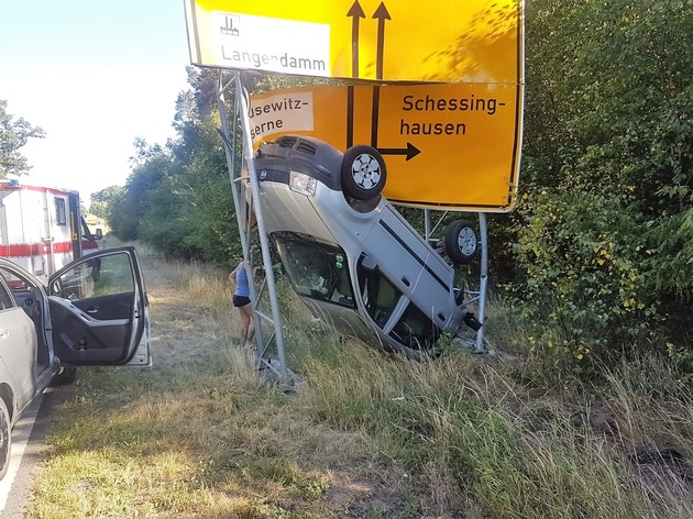 (BER)Eine ungewöhnliche Lage eines verunfallten Pkw fanden Polizeibeamte der Nienburger Polizeidienststelle vor, als sie am Sonntagabend, 08.07.2018 zur Einsatzstelle auf die B 6 gerufen wurden. Nach bisherigen Ermittlungen war eine 19-jährige Frau aus Barsinghausen mit ihrem Fiat auf der Bundesstraße 6 in Richtung Hannover unterwegs, als sie gegen 17.45 Uhr aus ungeklärter Ursache kurz vor der Kreuzung mit dem Führser Mühlweg nach rechts von der Fahrbahn abkam und in den Halterungen eines Vorwegweisers überkopf zum Stoppen kam. Die B 6 musste für die Unfallaufnahme und die Pkw-Bergung bis ca. 19.30 Uhr teilweise gesperrt werden. Die untere Wasserbehörde wurde informiert, da Betriebsstoffe in den Graben unter dem Fahrzeug geraten waren. Die Fahrerin wurde verletzt in die Helios-Klinik in Nienburg eingeliefert.