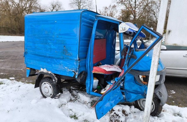 Beide Fahrzeuge kollidierten miteinander. Durch den Zusammenstoß beider Fahrzeuge wird der 73-jährige mit seiner Ape durch die Luft geschleudert, überschlägt sich und kommt auf der rechten Fahrzeugseite an einem Straßenschild zum Liegen. Der Fahrer wurde eingeklemmt und konnte durch die Feuerwehr mit einer Rettungsschere aus dem Fahrzeug befreit werden.