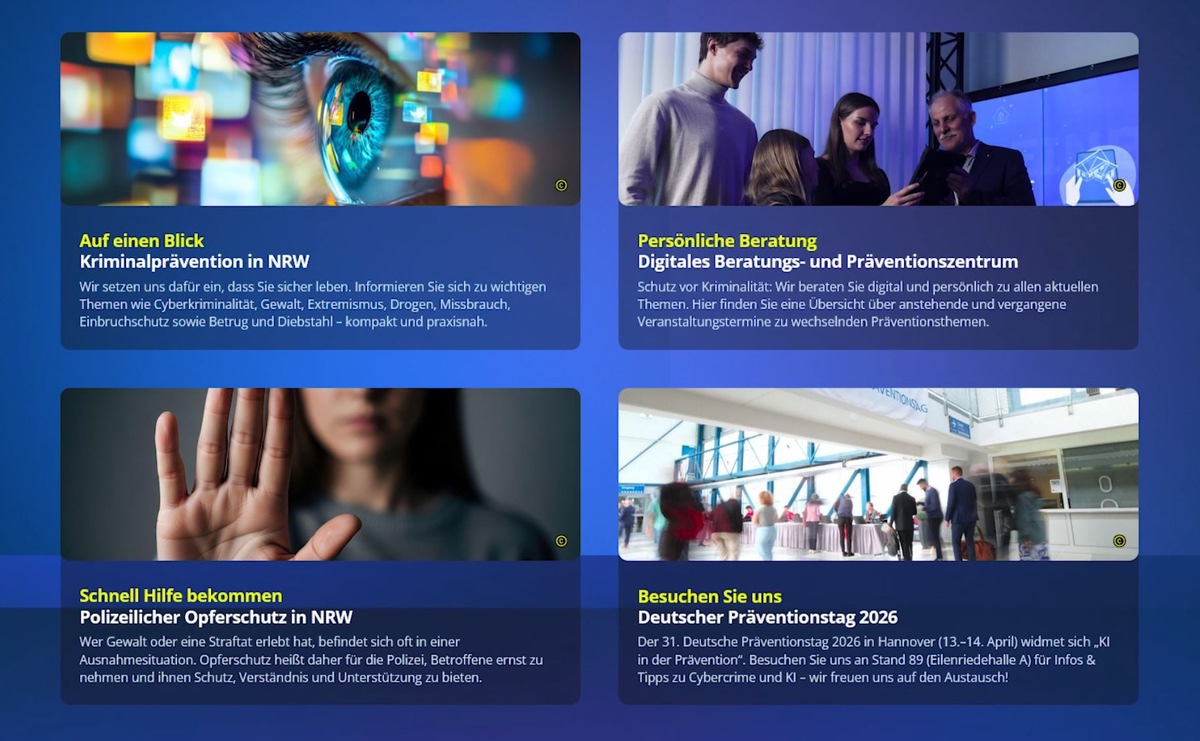 Orientiert an den Bedürfnissen einer modernen Gesellschaft bündelt die Präventionsseite der Polizei Nordrhein-Westfalen Informationen sowie Angebote zur vorbeugenden Kriminalitätsbekämpfung barrierefrei und auch für die mobile Ansicht optimiert. Dank der übersichtlichen Benutzeroberfläche finden Nutzerinnen und Nutzer schnellen Zugang zu den aktuellen Fokusthemen, wie zum Beispiel Einbruchschutz oder Cybercrime. Auf der Internetseite ist auch ein direkter Link zum Beteiligungsportal NRW, über welches die Teilnahme an Veranstaltungen im Digitalen Beratungs- und Präventionszentrum unmittelbar gebucht werden kann. Kontakte zu Anlaufstellen für Opfer von Straftaten sowie zu Kooperationspartnern vervollständigen das Angebot.