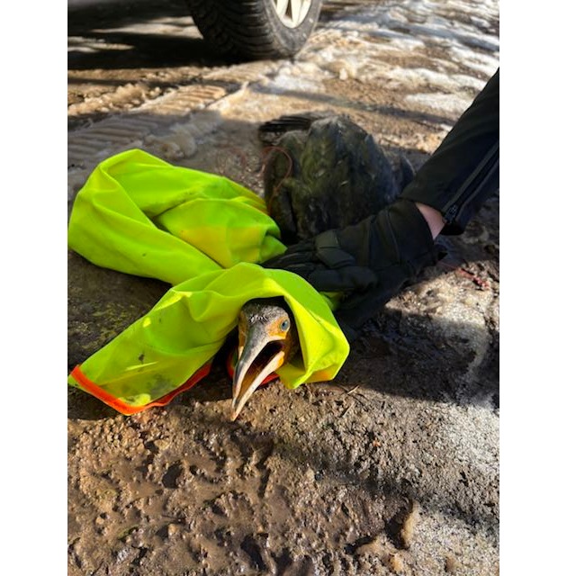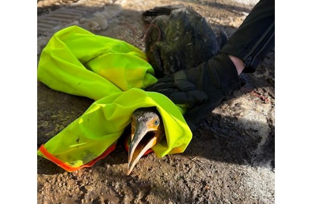 Einer aufmerksamen Passantin war gestern Mittag (14.01.2026) gegen 13:30 Uhr im Bereich der Dammaschwiesen in Celle ein hilfloser Kormoran aufgefallen. Das Tier hatte sich offenbar in einer Angelschnur verheddert, die sich auch schon eng um seinen Hals gewickelt hatte. Die Frau alarmierte nach eigenen schmerzhaft fehlgeschlagenen Fehlversuchen zur Rettung des Tieres die Polizei. Die Beamten fingen das Tier ein, wobei es bei der "Festnahme" erheblichen Widerstand leistete und nur unter seinem vehementen Protest mitgenommen werden konnte. In einer Tierarztpraxis wurde der Großvogel von den Schnüren befreit und kurz darauf wieder in die Freiheit entlassen.