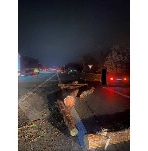 Mehrere Baumstämme blockierten heute Morgen im Bereich des Maschener Kreuzes Teile der A1 in Fahrtrichtung Hamburg. Gegen 6:40 Uhr lösten sich mehrere etwa 4 m lange Stämme und rutschten vom Anhänger eines LKW. Die Stämme verteilten sich im Bereich der Einfädelung von der A 39 auf die A1 auf der Fahrbahn.