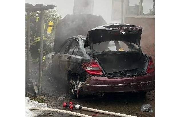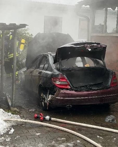 Durch das schnelle Eingreifen der Feuerwehr wurde das Übergreifen eines Feuers auf ein Wohnhaus am Montag, 26.01.2026, gegen 14:50 Uhr, in der Bremer Straße in Nenndorf verhindert. Die alarmierten Einsatzkräfte konnten einen in Vollbrand stehenden Mercedes C220, der aus bislang unbekannter Ursache in Brand geraten war, zügig löschen. Durch das Feuer wurde ein Dachüberstand, das Dach einer angrenzenden Garage sowie Teile einer angrenzenden Werkstatt beschädigt. Der Gesamtschaden wird auf etwa 25.000 Euro geschätzt. Verletzt wurde niemand. Die Polizei beschlagnahmte den Brandort um die Brandursache zu ermitteln. Die Ortsdurchgangsstraße wurde für die Dauer der Löscharbeiten komplett gesperrt.