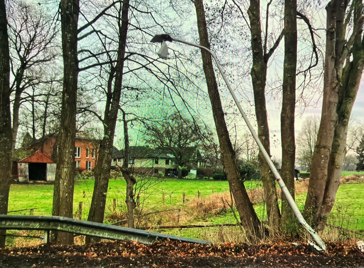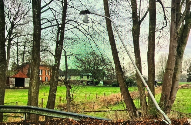 Ein Lkw oder ein landwirtschaftliches Fahrzeug befuhr die K 219 von Sothel in Richtung Hamersen, als das Fahrzeug in einer leichten Linkskurve in den aufgeweichten Seitenraum geriet. Dabei wurde eine Straßenlaterne stark beschädigt. Zusätzlich entstand Schaden am Seitenraum und am Asphalt. An der Laterne fanden die Beamten grünen Lackabrieb. Der Gesamtschaden wird auf rund 2.000 Euro geschätzt.