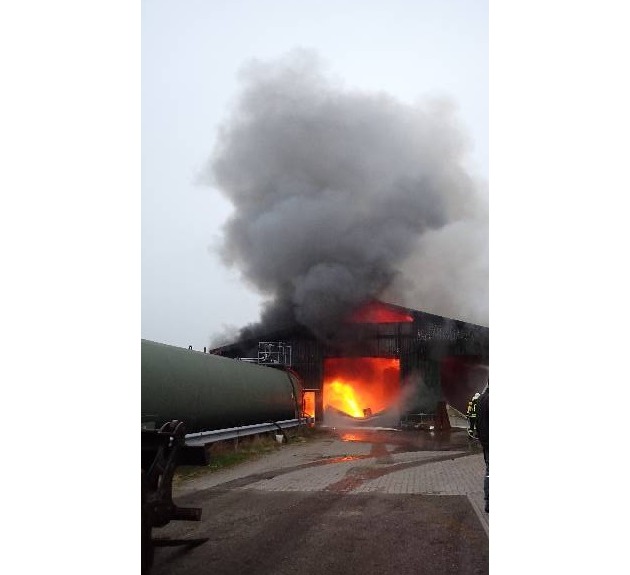 Am Mittwoch, den 17.12.2025 um kurz nach 15 Uhr kam es zu einem Brand in einer landwirtschaftlichen Lagerhalle, welche zur Lagerung von Gärresten einer Biogasanlage genutzt wird. Durch einen Mitarbeiter des Betriebes konnte starke Rauchentwicklung festgestellt werden, woraufhin er die Feuerwehr verständigte. Bei Eintreffen der ersten Einsatzkräfte stand die Halle bereits nahezu in Vollbrand. Durch sieben Feuerwehren aus der Umgebung konnte der Brand zügig unter Kontrolle gebracht werden. Somit wurde ein Übergreifen der Flammen auf eine benachbarte Halle, in der sich ca. 10.000 Liter Schwefelsäure befanden, verhindert. Durch die große Hitzeeinwirkung auf die Stahlkonstruktion bestand zwischenzeitlich Einsturzgefahr für die Halle. Der Sachschaden wird auf etwa eine Millionen Euro geschätzt. Durch die Polizei wurden die Ermittlungen zur Brandursache aufgenommen.