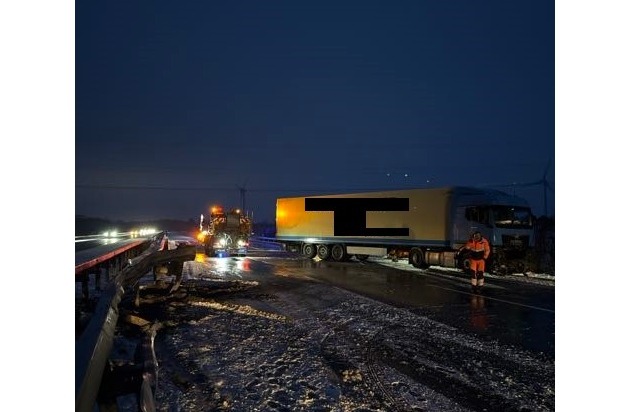 Kurze Zeit später, gegen 04:50 Uhr, ereignete sich auf derselben Strecke, rund 500 Meter hinter der ersten Unfallstelle, ein weiterer Verkehrsunfall. Ein 51-jähriger Mann verlor mit seinem Sattelzug ebenfalls auf glatter Fahrbahn die Kontrolle über das Fahrzeug. Der Sattelzug geriet ins Schleudern, prallte gegen die Mittelschutzplanke und kam anschließend quer auf der Fahrbahn zum Stehen. Der Fahrer zog sich leichte Verletzungen zu und wurde vor Ort rettungsdienstlich versorgt. Auch hier ist die Schadenshöhe noch Teil der laufenden Ermittlungen.