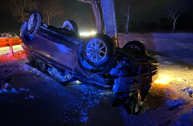 Nachdem die Schutzplanke baulich endete, kam der VW weiter von der Fahrbahn ab, prallte gegen eine neu beginnende Schutzplanke und überschlug sich. Das Fahrzeug kam auf dem Dach im Seitenraum zum Stillstand.