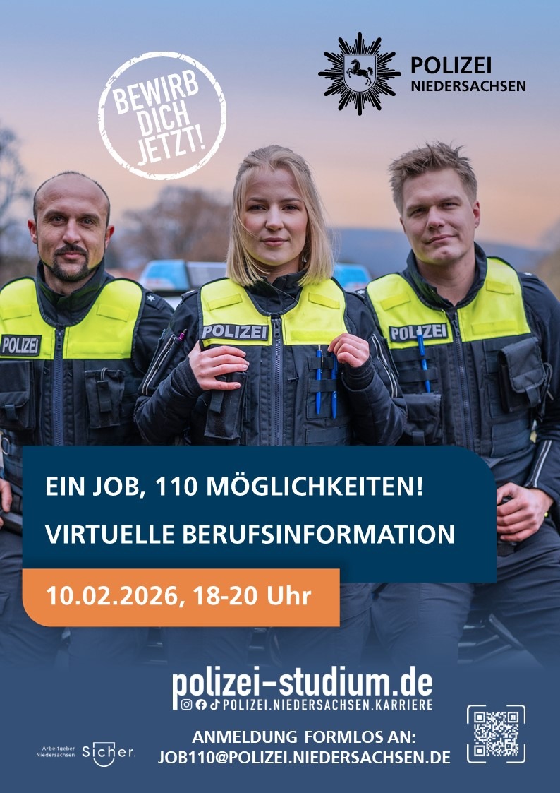 Die Polizei Niedersachsen öffnet wieder ihre digitalen Türen: Am Dienstag, den 10.02.2026, findet von 18:00 bis 20:00 Uhr eine landesweite virtuelle Informationsveranstaltung für alle statt, die sich für das Studium und den Polizeiberuf interessieren.