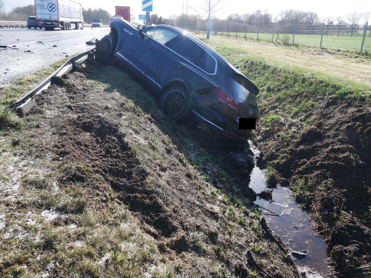 In einem Fall kam eine Frau in Richtung Bremen kurz vor Stuckenborstel ohne Fremdeinwirkung bei Graupel von der Fahrbahn ab und überschlug sich mit ihrem VW (siehe Bild). Hierbei zog sie sich leichte Verletzungen zu. Bei einem anderen Unfall waren sechs Fahrzeuge involviert.