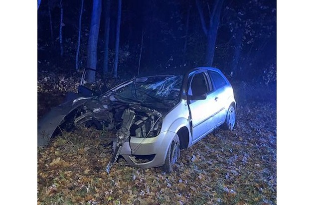 Vermutlich aufgrund nicht angepasster Geschwindigkeit auf regennasser Fahrbahn kam es heute in den frühen Morgenstunden zu einem Verkehrsunfall auf der B 71 zwischen Soltau und Harber. Die beiden 20-jährigen Fahrzeuginsassen waren auf dem Weg zu ihrem Wohnort nach Munster, als sie mit ihrem Ford Fiesta nach rechts von der Fahrbahn abkamen und frontal mit einem Baum kollidierten. Der Motorblock wurde aus dem Pkw herausgerissen und lag einige Meter entfernt vor diesem. Die beiden Heranwachsenden wurden leicht verletzt zur Behandlung ins Krankenhaus gebracht. Trotz des Pkw-Totalschadens und der Verletzungen können sich beide Männer glücklich schätzen, da solche Unfälle auch tödlich enden können. (Foto in der Anlage)