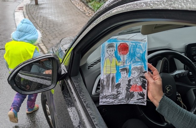 Zudem überreichten die Kinder den zu schnell fahrenden Verkehrsteilnehmenden selbst gestaltete Ausmalbilder - als freundliche Erinnerung und als Hinweis darauf, dass gerade vor Kindergärten besondere Vorsicht geboten ist.
