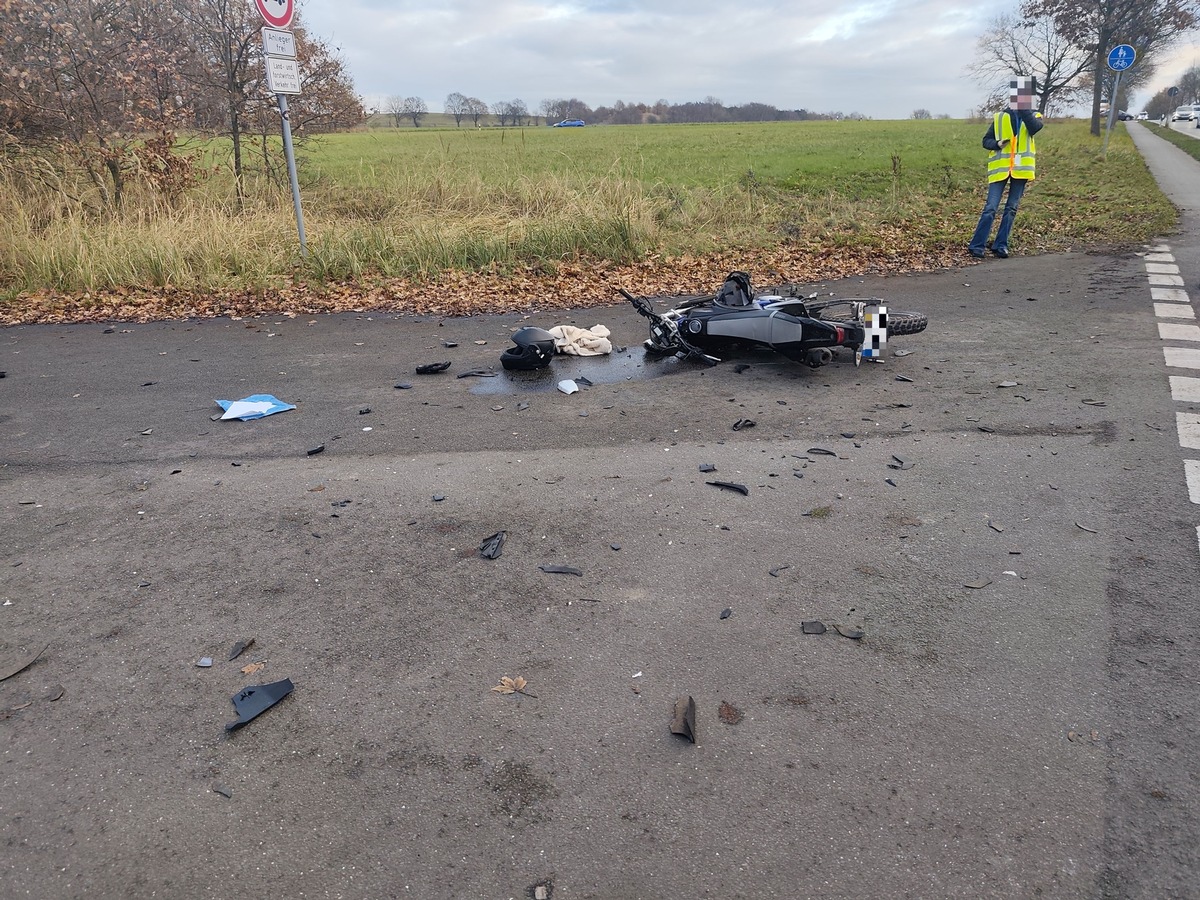 Das Motorrad wurde total beschädigt und auch der PKW trug erhebliche Schäden davon.