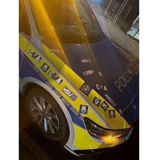 1. Unbekannte bekleben Streifenwagen mit HSV-Stickern