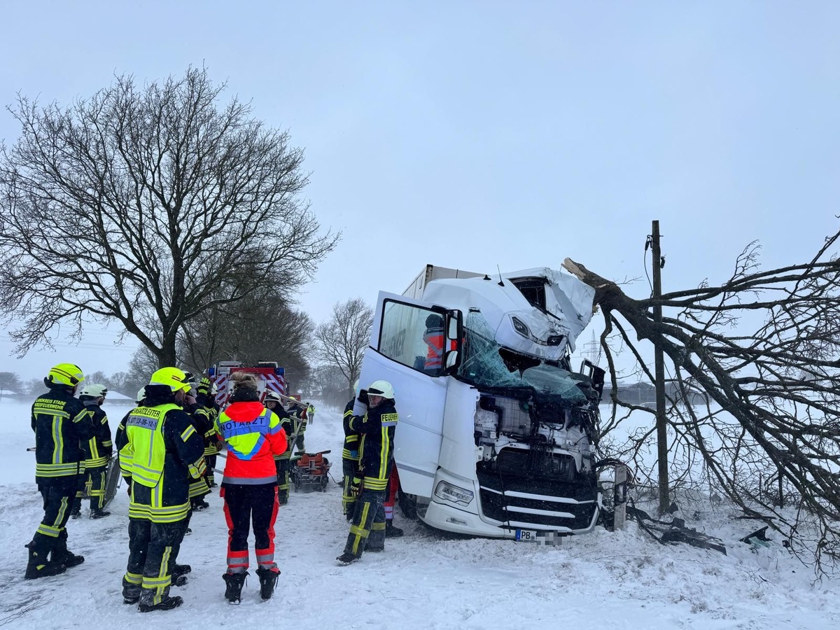 Am heutigen frühen Nachmittag gegen 12:45 h ist es auf der Landesstraße 123 zwischen Ohrensen und Issendorf zu einem Verkehrsunfall gekommen, bei dem der Fahrer eines LKW schwere Verletzungen erlitt. Der 60-jährige Fahrer aus Hamburg war zu der Zeit mit seinem DAF-Transport-LKW auf der Landesstraße aus Richtung Kreisel Linah in Richtung Issendorf unterwegs. Er hatte dann bei winterglatter Fahrbahn zwei vor ihm fahrende Autos überholt. Dabei verlor er die Kontrolle über sein Fahrzeug kam aufgrund der Glätte nach links von der Fahrbahn ab und prallte gegen einen Straßenbaum. Der 60-Jährige wurde in dem völlig zerstörten Fahrerhaus eingeschlossen und musste von den ca. 45 Feuerwehrleuten der angerückten Ortswehren aus Ohrensen und Harsefeld befreit werden. Nach der Erstversorgung an der Unfallstelle durch den Notarzt wurde er anschließend vom Rettungsdienst mit schweren Verletzungen ins Stader Elbeklinikum eingeliefert. An seinem LKW entstand Totalschaden, der Gesamtschaden wird auf ca. 30.000 Euro geschätzt. Die Feuerwehrleute sicherten das Unfallfahrzeug ab. Die L 123 musste für die Zeit der Rettungs- und Bergungsmaßnahmen sowie die Unfallaufnahme zeitweise voll gesperrt werden. Zu größeren Behinderungen kam es dabei aber nicht.