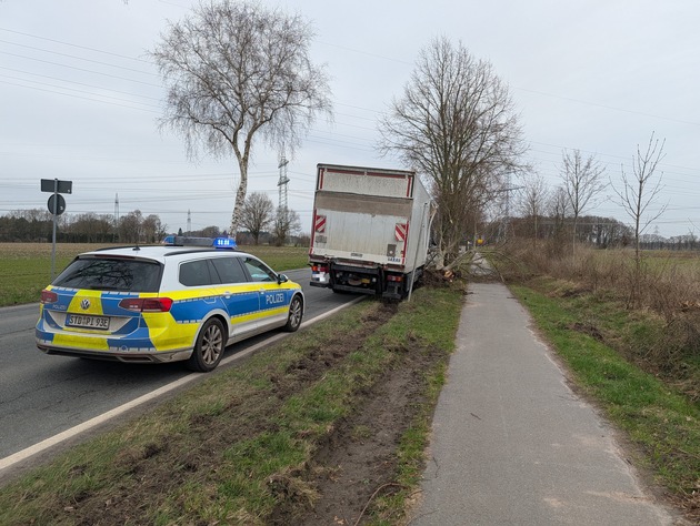 POL-STD: LKW-Fahrer weicht entgegenkommendem Sattelzug aus und prallt im Seitenraum gegen einen Baum - Fahrer bleibt unverletzt - Polizei sucht Verursacher und Zeugen