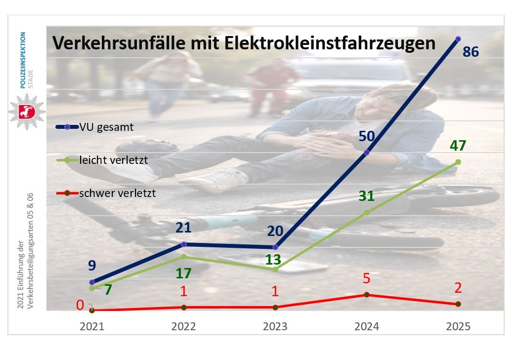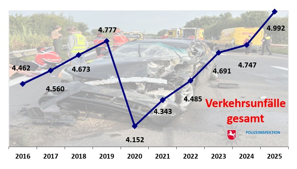 2025 ereigneten sich im Landkreis Stade insgesamt 4.992 (+ 245) Verkehrsunfälle. Davon ca. 34 % auf den Gebieten der Hansestadt Stade und 21 % der Hansestadt Buxtehude. Rund 70 % aller Verkehrsunfälle ereigneten sich innerhalb, 30 % außerhalb geschlossener Ortschaften. Etwa ein Viertel aller Verkehrsunfälle standen im Zusammenhang mit ruhendem Verkehr und Ein- oder Ausparkvorgängen. Acht Personen verloren im letzten Jahr bei sechs VU auf den Straßen des Landkreises Stade ihr Leben. Als Getötete werden alle Personen gezählt, die innerhalb von 30 Tagen nach dem Unfall an den Unfallfolgen verstorben sind.