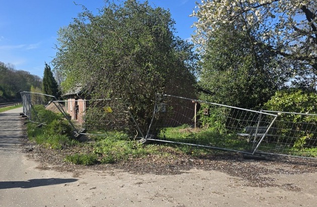 In der Zeit zwischen Freitag, den 17.04., 18:00 h und Samstag, den 18.04., 19:40 h wurde in Agathenburg im Wiesenweg am Bahnhof ein dort an einem Grundstück aufgestellter Bauzaun eingerissen und beschädigt.