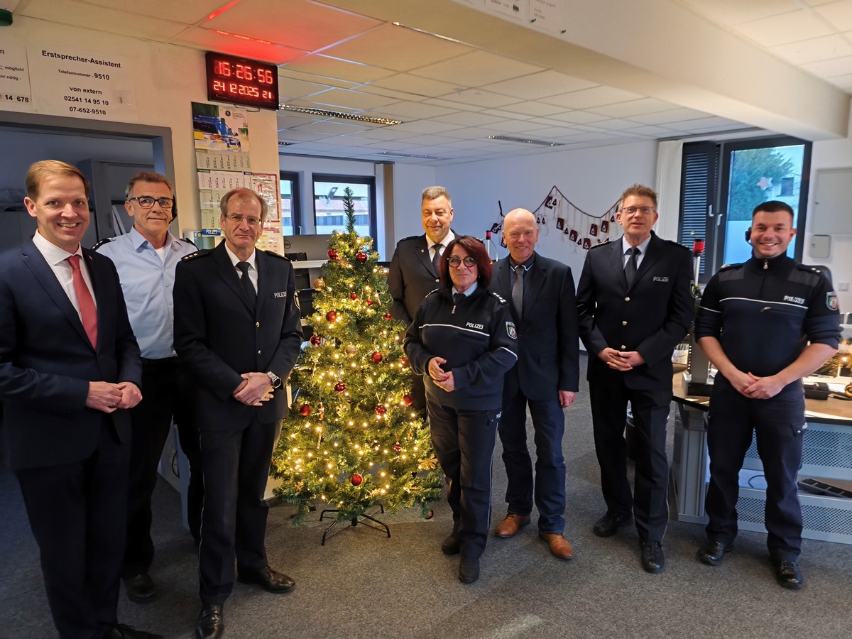 Landrat Dr. Christian Schulze Pellengahr besuchte auch dieses Jahr mit Abteilungsleiter Thomas Eder, dem Personalratsvorsitzenden Kai Hartweg sowie Christian Sommer als Leiter der Direktion Gefahrenabwehr/ Einsatz an Heiligabend (24.12.25) die drei Polizeiwachen Coesfeld, Dülmen und Lüdinghausen sowie die Leitstelle. Die diensthabenden Polizisten freuten sich über die wertschätzende Geste und die Möglichkeit, sich auszutauschen.