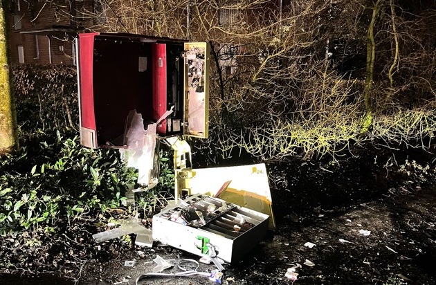 Unbekannte haben in der Nacht auf Freitag (16.01.26) einen Zigarettenautomaten an der Merfelder Straße gesprengt. Geschehen ist das gegen 00.45 Uhr. Angaben über mögliche Beute liegen derzeit nicht vor. Die Polizei in Dülmen bittet unter 02594-7930 um Hinweise.