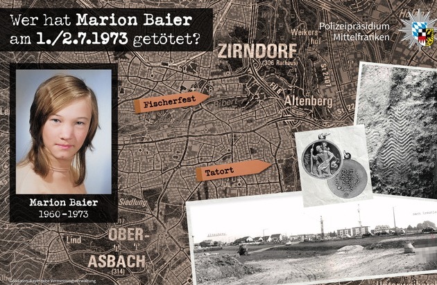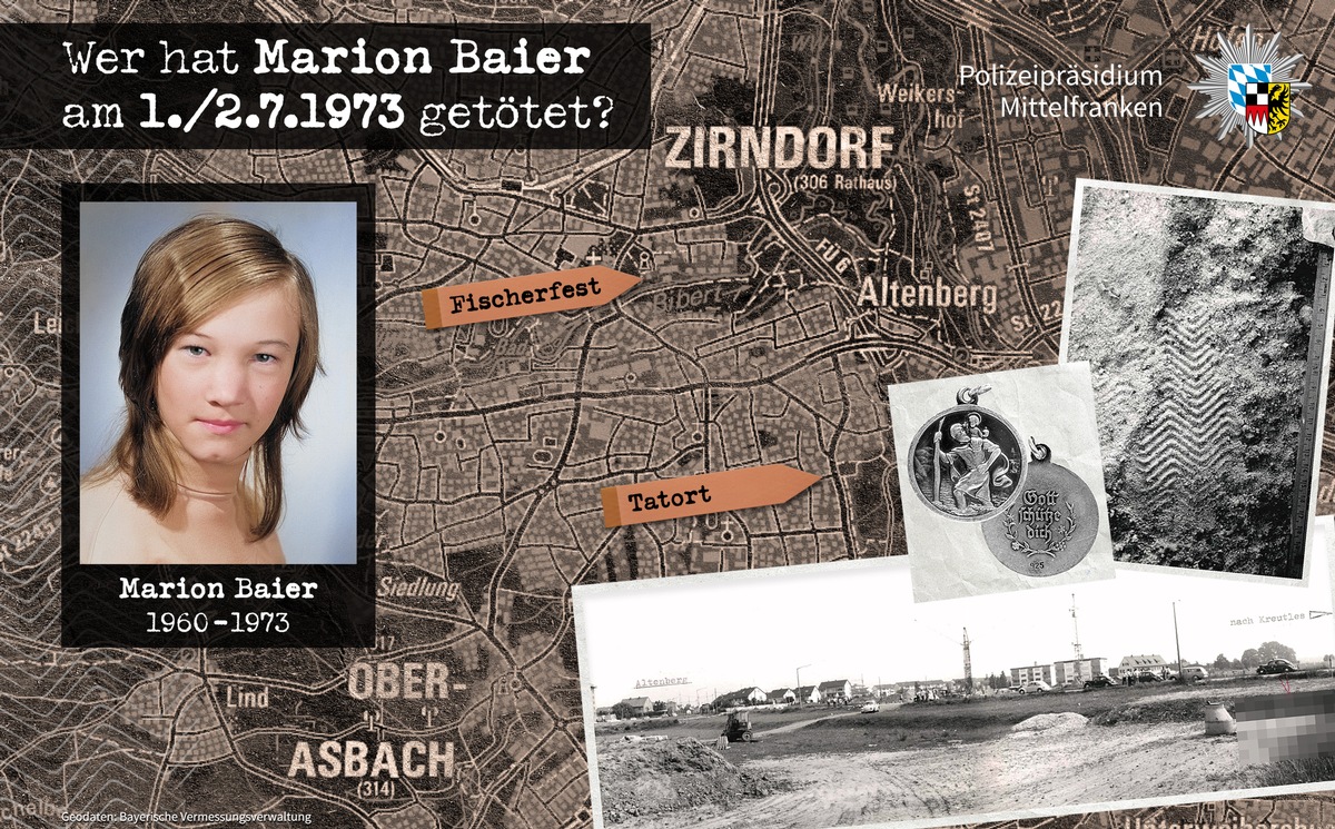 Die 12-jährige Marion Baier war in der Nacht vom 01. auf den 02. Juli 1973 im Anschluss an den Besuch des Fischerfestes in Zirndorf mutmaßlich von einem Sexualstraftäter getötet worden. Bis zum heutigen Tag konnte der Mord an dem Mädchen nicht aufgeklärt werden.