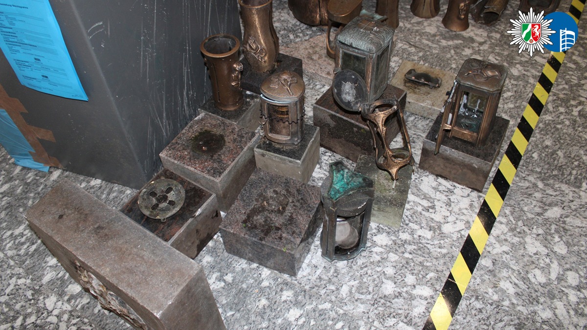 Im unmittelbaren Umfeld stellten die Polizeibeamten zahlreiche Bronze- und Metallgrablichter fest, die aus umliegenden Gräbern entfernt und auf den Wegen des Friedhofs abgelegt worden waren. Zudem wurden mehrere Ansammlungen von Grablichtern auf dem Friedhofsgelände entdeckt. Bei den Tatverdächtigen wurden Fahrzeugschlüssel aufgefunden, von denen ein Schlüssel einem Pkw im Bereich Wittekindstraße/Hoffmannstraße zugeordnet werden konnte.