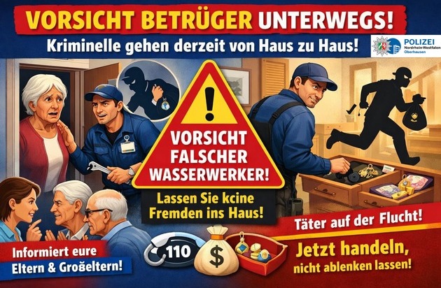 Erst gestern, am frühen Dienstagnachmittag (20.1.), klingelte ein Betrüger sturm an der Wohnungstür einer 81jährigen Oberhausenerin auf dem Ebereschenweg. Der Kriminelle gab sich als Wasserwerker aus, der wegen eines angeblichen Notfalls dringen in der Wohnung der Seniorin etwas überprüfen müsse.