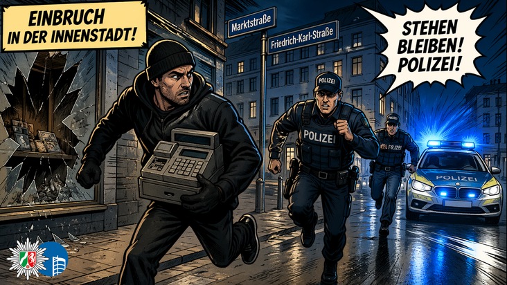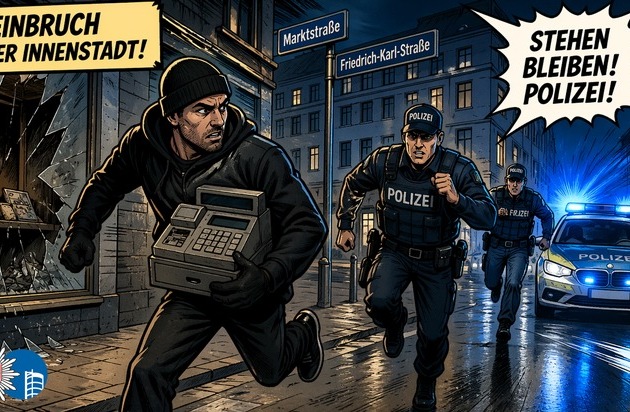 Am Freitagmorgen (24.04.) kam es an der Kreuzung Marktstraße/Friedrich-Karl-Straße zu einem Geschäftseinbruch. Der Tatverdächtige konnte auf seiner fußläufigen Flucht unmittelbar festgenommen werden.