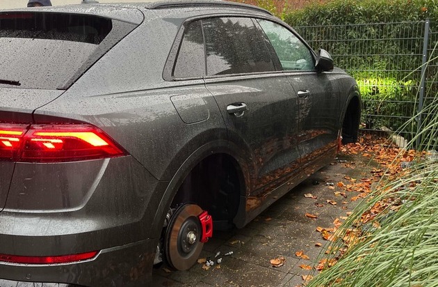 Gegen 08:30 Uhr klingelte der Nachbar an der Tür des Pkw-Halters in der Straße Im Wiefelpützfeld und machte ihn auf die Straftat aufmerksam. Dem Pkw des Mannes, Marke Audi, Modell SQ8, fehlten alle vier Reifen samt Felgen. Der Audi stand aufgebockt vor dem Haus des Pkw-Halters. Zudem hatten die unbekannten Täter auch die am Haus installierte Videokamera des Geschädigten gestohlen.